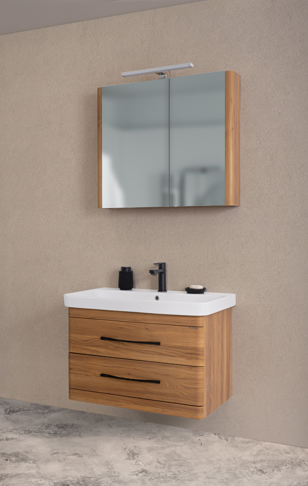 • Fiókos tárolórendszer: A tágas fiókok lehetővé teszik a fürdőszobai eszközök rendszerezett tárolását.