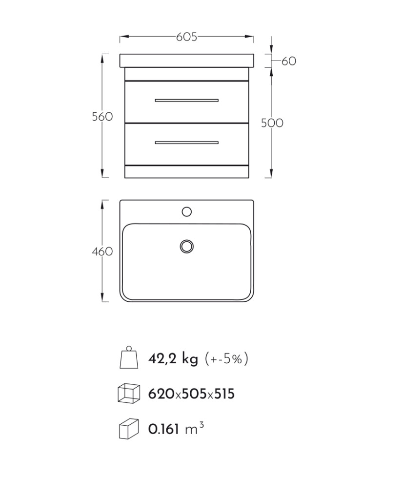 LUXOR FA60 Fahatású Fóliázott Fügesztett soft-close rendszerű két fiókos Fürdőszobabútor Kerámia Mosdókagylóval (60,5*56*46 cm)