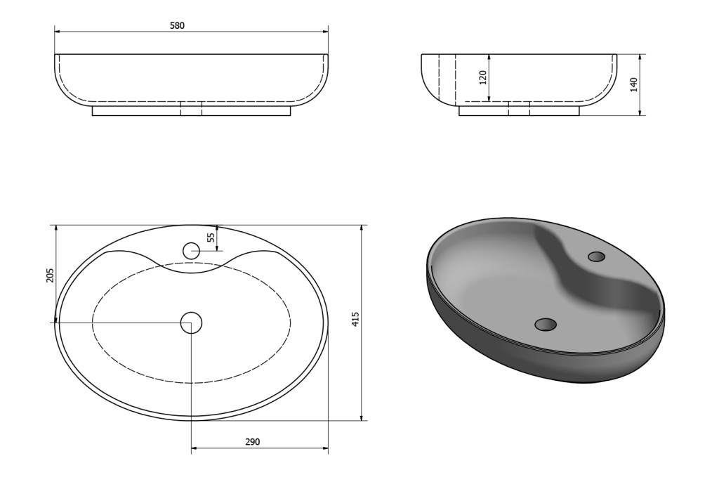 MARIANA pultra szerelhető kerámiamosdó, túlfolyó nélkül, 57x14,5x41cm