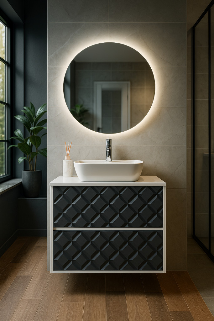 A Mistik bútorok ideális kombinációt alkotnak a kompakt polccal és a felületi mosdóval, amely esztétikus és praktikus kialakítást nyújt. Az Art kerek tükrökkel párosítva - melyek diszkrét LED-világítással rendelkeznek - nemcsak praktikus, hanem hangulatos látványt is kínálnak és bármely fürdőszobát modern, mégis meghitt hellyé varázsolnak.
